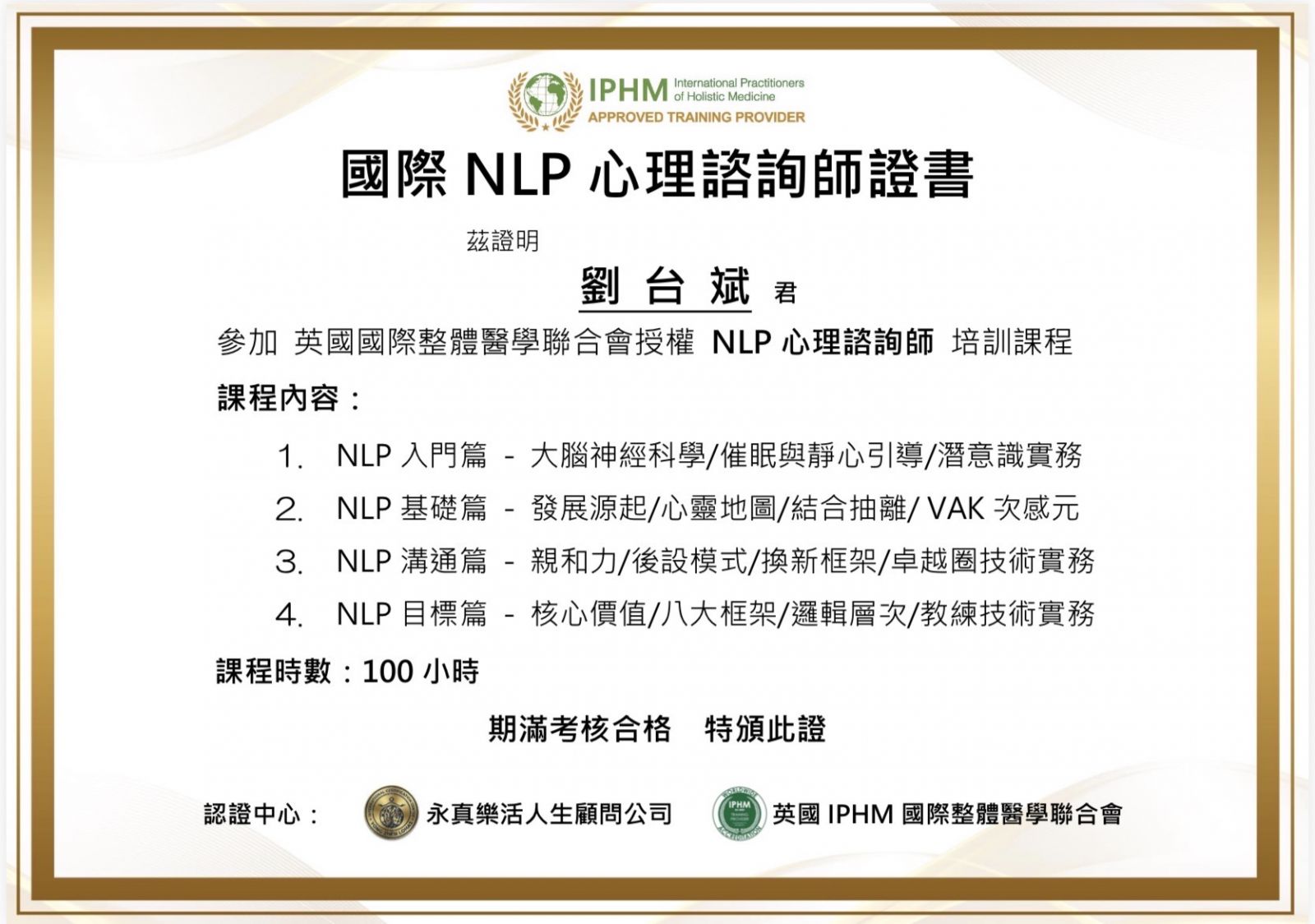 結業考核通過, 可取得美國 iNLP 國際NLP中心【國際 NLP 專業執行師】中文國際版證照乙張, 英國 IPHM 國際整體醫學執行師聯合會【國際心理諮詢師】英文及中文國際版證照兩張, 及英國 IAOTH 國際理療師協會【國際療癒師會員】英文版國際證照乙張, 共四張。