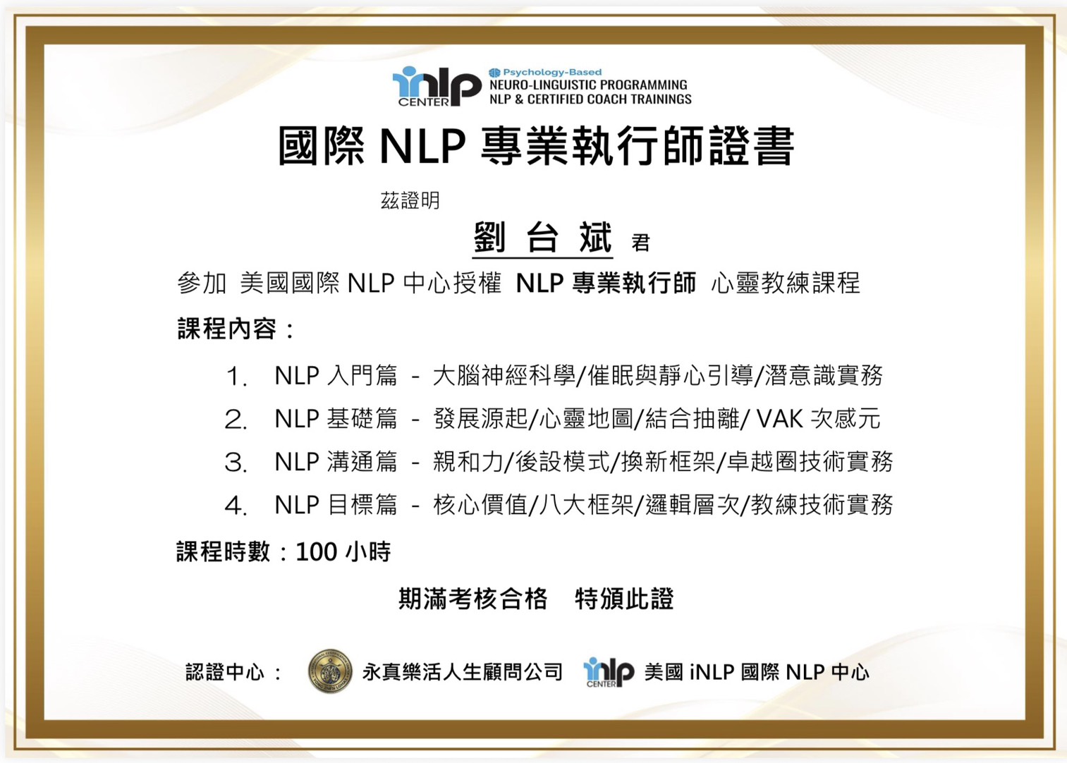 1. 美國 iNLP 國際NLP中心 【NLP 專業執行師】英文原廠親簽證照乙張。